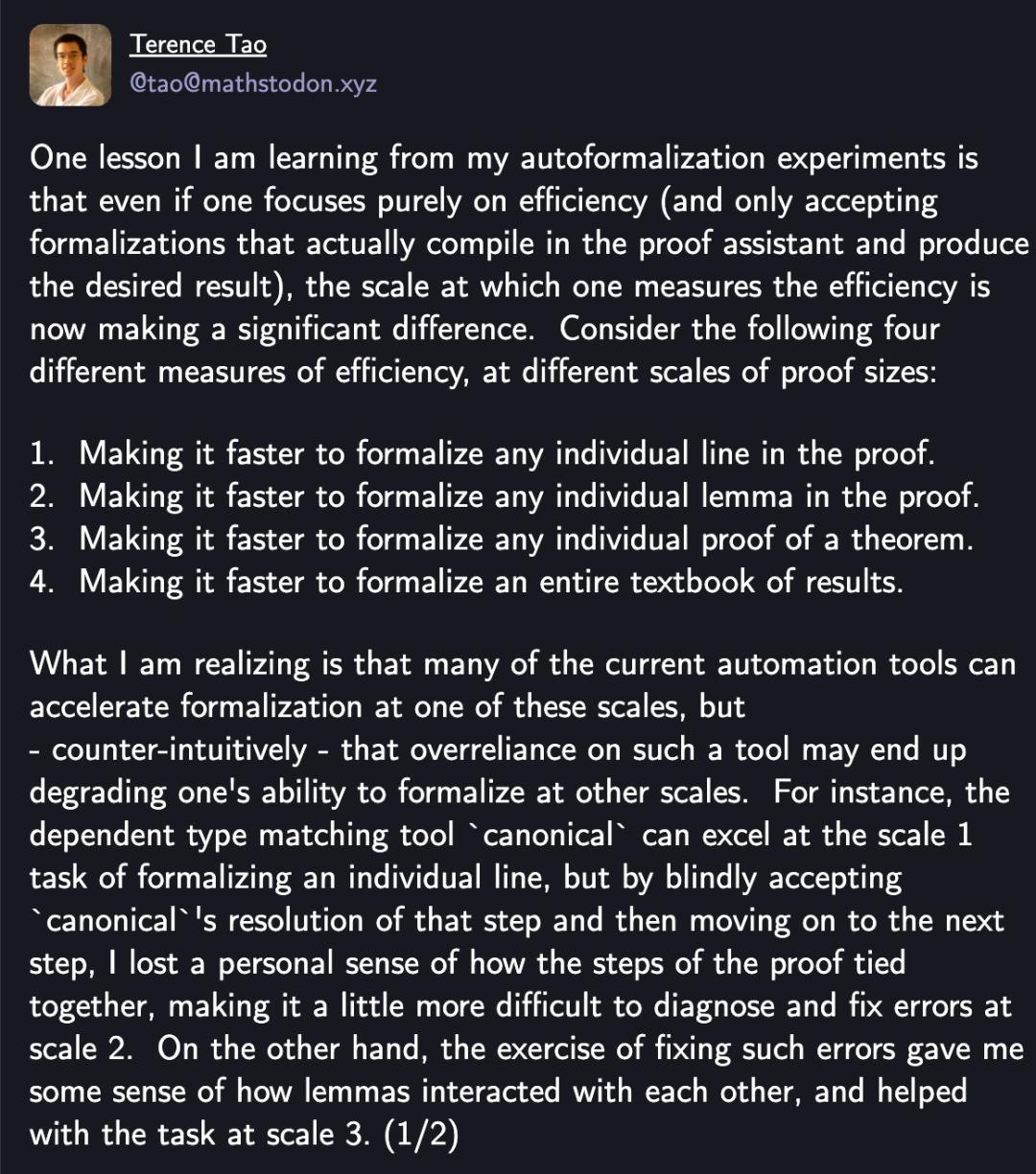 此前他提出了四个不同的效率衡量尺度:形式化证明中的任何单行、任何单个引理、任何定理的完整证明,以及整本教科书。