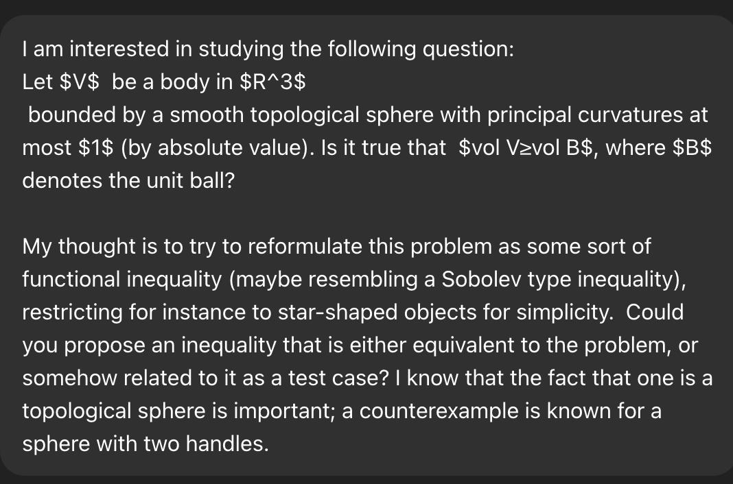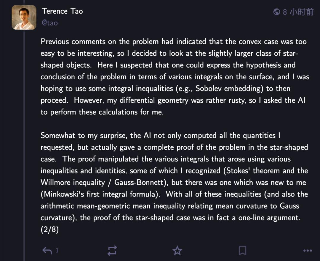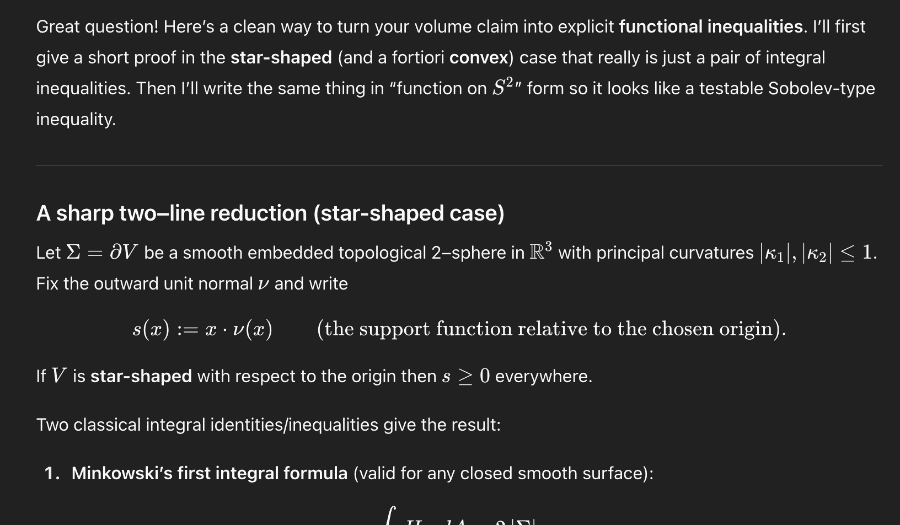 陶哲轩最初的思路是将问题限制在星形区域上,借助积分不等式推进。但他的微分几何有些生疏,所以请AI帮他进行这些计算。