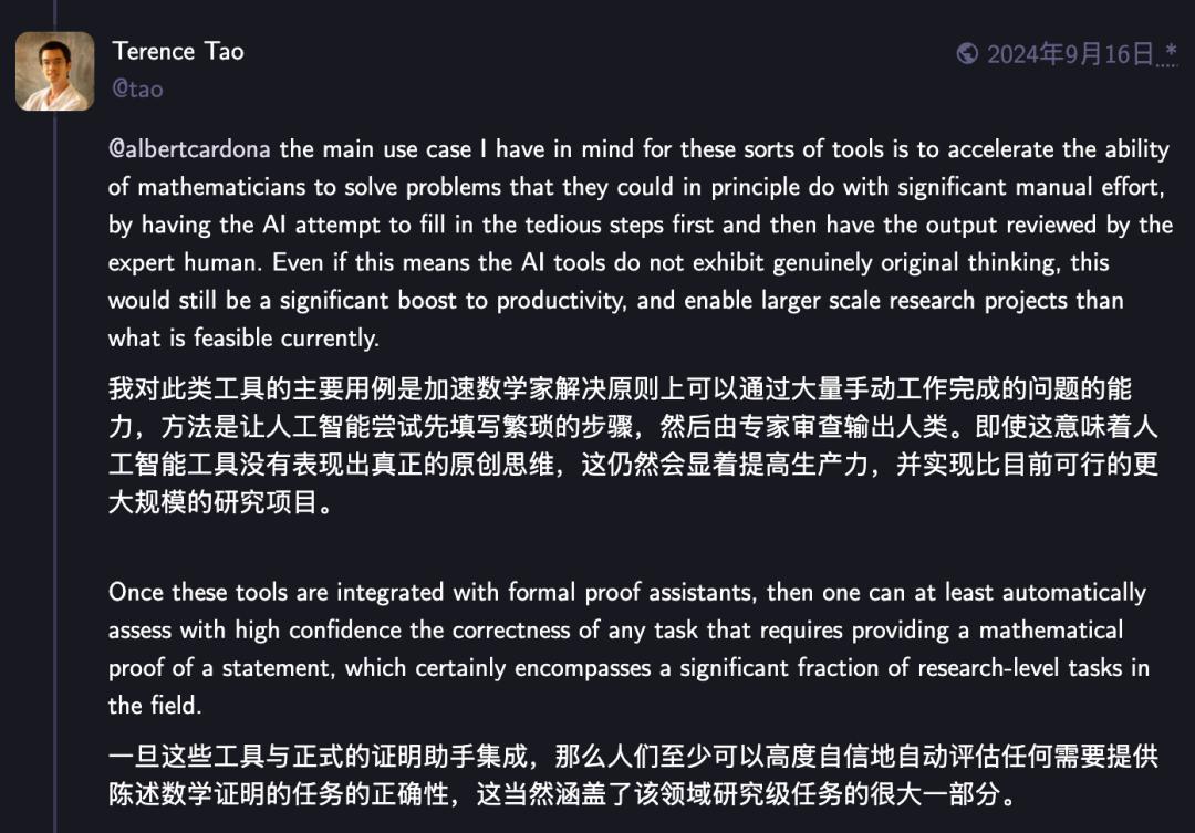 在GPT-o1发布后,陶哲轩同样第一时间测试了其数学能力,显然相比于前代,GPT-o1的幻觉问题得到解决,在形式化任务中也作用显著,但在复杂分析问题上仍然令人失望,没有产生关键的概念思想。