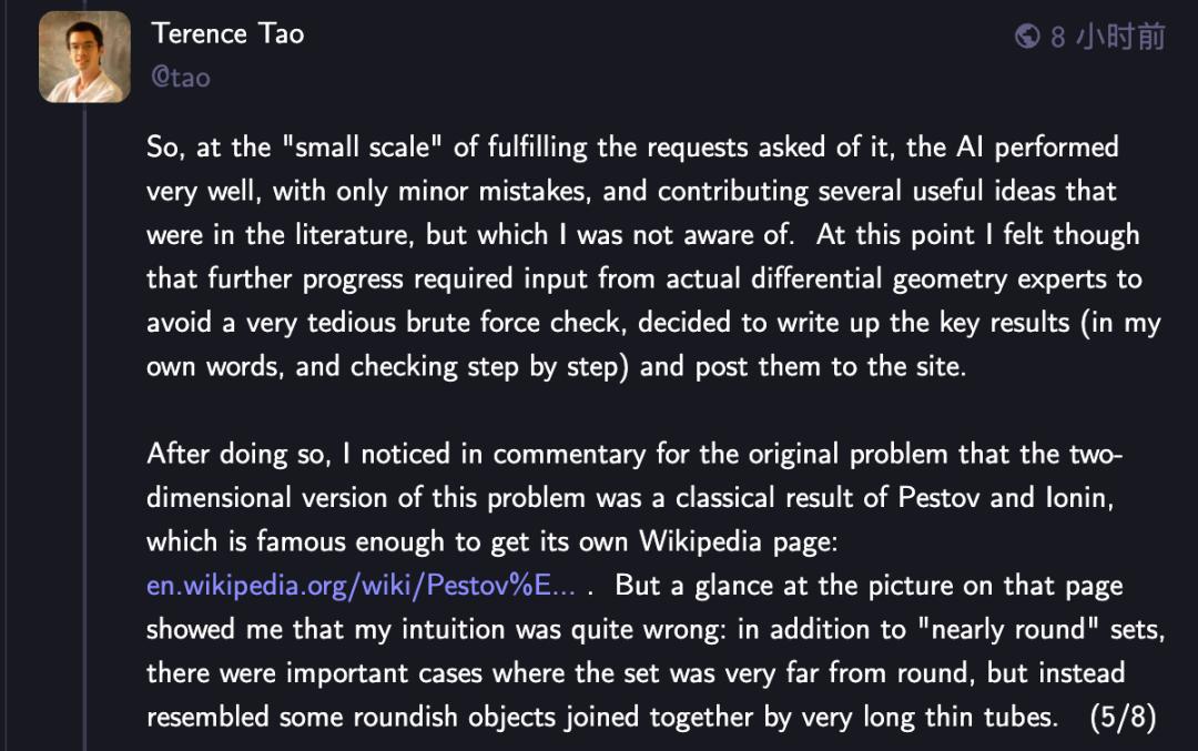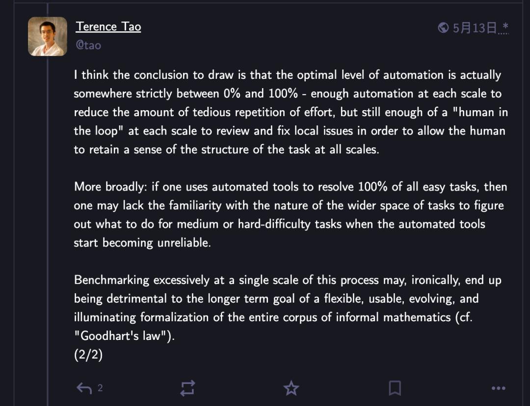 正如他一直所说的那样,AI正在重塑人类科学范式,其最合理的角色是成为数学家的“副驾驶”或助理,而不是取代人类在创造性、直觉性、策略性上的工作。