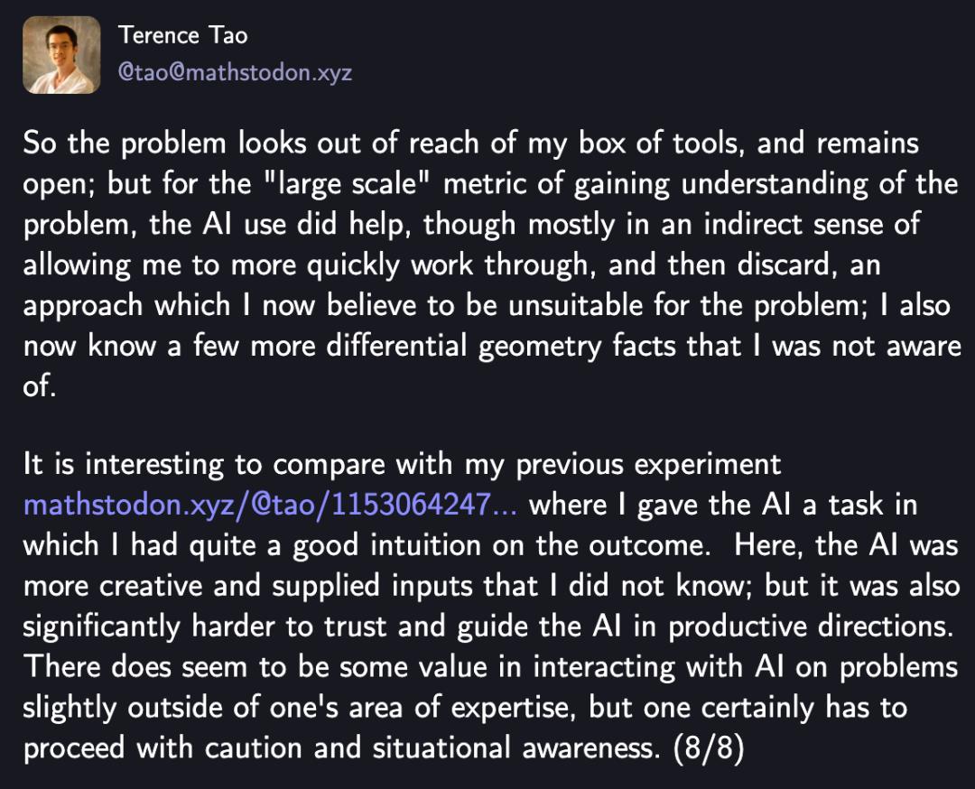 他认为,在自己专业领域之外的问题上与AI互动似乎确实有一些价值,但必须谨慎行事并保持对情况的认知。
