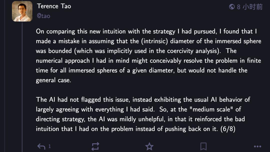 陶哲轩一开始的直觉是错的,AI也没有发现问题,基本上只是附和同意他说的一切。