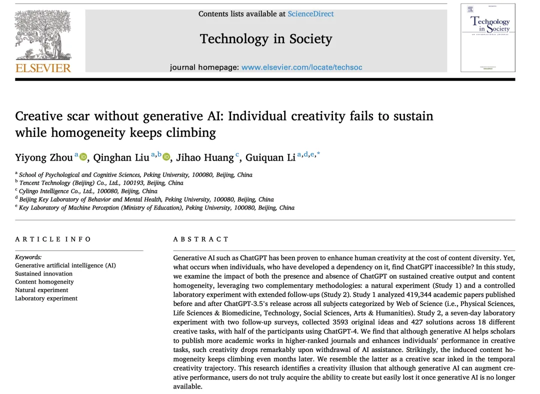 这项纵向追踪研究用直接的因果证据,证实了AI对个人创造力的长期影响。AI带来的可能只是一种无法内化的“创造力幻觉”,而它留下的思想趋同,却可能成为一道难以消除的“创意伤痕”,长期存在于我们的认知与表达习惯之中。