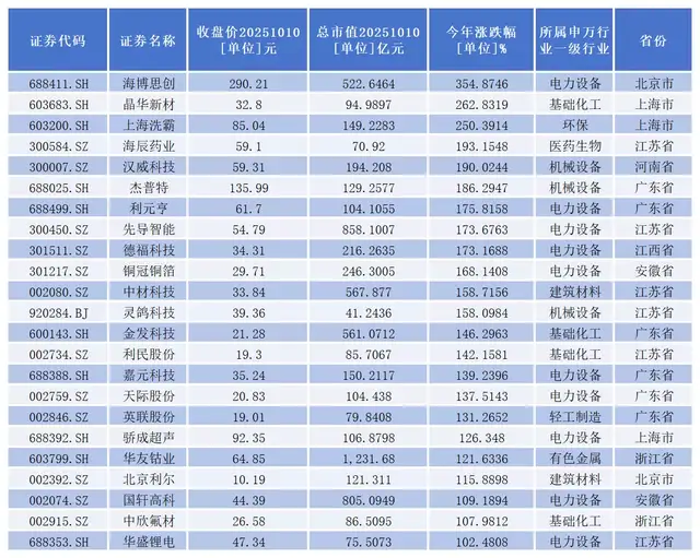 其中,23家上市公司股价成功实现翻倍,海博思创(688411.SH)、晶华新材(603683.SH)、上海洗霸(603200.SH)位居前三,年内股价涨幅均超过200%。