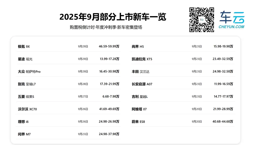 9月新车多,原本不是什么新鲜事,但今年确实有点格外疯狂了:方程豹钛7上旬上市,上市5天交付破千台;极狐T1身居纯电小车市场,上市1小时大定破2.6万;享界S9T以鸿蒙智行首款旅行车上市,后面跟着全新问界M7和被寄予厚望的尚界H5;奥迪E5 Sportback、领克10 EM-P、腾势N9、极氪9X也都陆续上市。