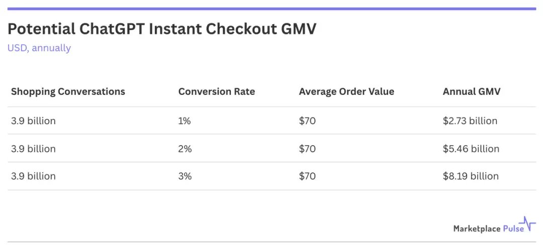 据Marketplace Pulse推算,即使转化率较低,假设只有 2% 的产品对话促成平均订单价值 70 美元的购买,也能产生 55 亿美元的年 GMV,大约相当于Etsy 全球市场的一半。