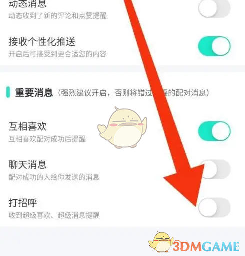 4、最后在此页面启用"打招呼消息"功能,就不会错过潜在缘分的问候了。