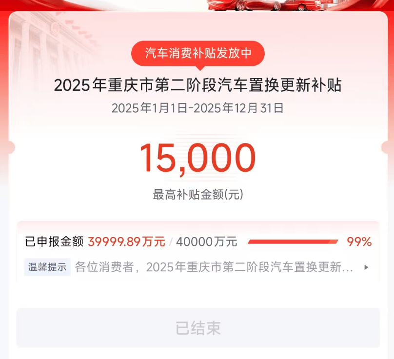 与上海的创新模式不同,国内多数城市仍沿用传统的"先到先得"补贴发放方式。以重庆市为例,该市在2025年8月追加3亿元预算用于汽车置换更新补贴,明确采用"总额控制、先报先得、用完即止"的原则。同年9月,重庆再次追加1.35亿元用于汽车及电动自行车以旧换新补贴,继续坚持这一模式。