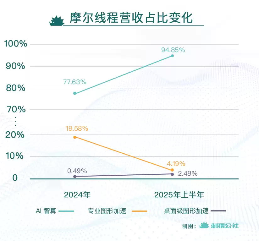 若不是强劲的AI需求拉动,摩尔线程也不会取得从ToC到ToB的业务转型成果。2024年,摩尔线程的AI智算收入从无到有,占比跃升至77.63%,成为营收支柱,2025年上半年,更是高达94.85%。类似的,游戏相关业务还是英伟达在三四年前的主要营收来源,但目前AI计算收入已经占到英伟达收入的70%以上。