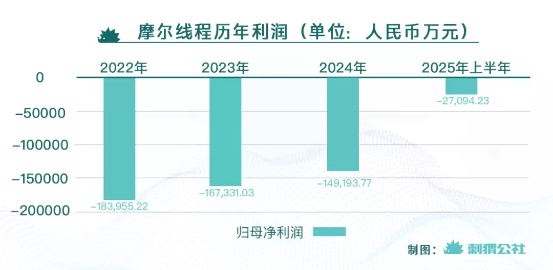 首先是扭亏时间遥遥无期。尽管相比2024年、2024年,摩尔线程在2025年上半年的亏损规模大幅度收窄,但最近三年,摩尔线程的经营性现金流持续为负,意味着这家公司本质上还不具备自我造血的能力,公司运营非常依赖外部融资,当前摩尔线程的累计亏损已经超过50亿元人民币,主要是高昂的研发支出造成了巨大的运营成本。