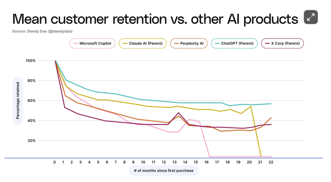 Menlo Ventures 投资人 Deedy Das 公布的数据里,ChatGPT 的留存率已经从两年前的 60% 提升到如今接近 90%,超过了长期保持记录的 YouTube(约 85%)。