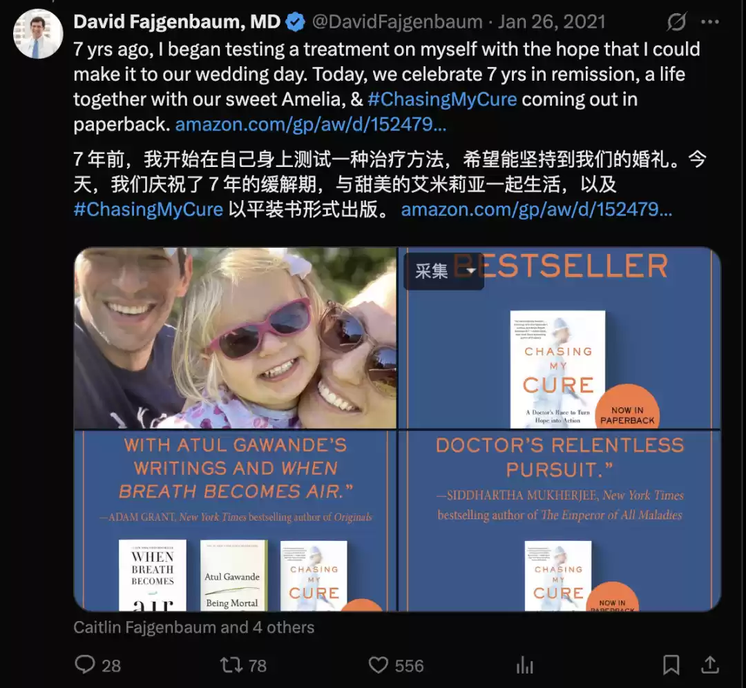 2024年,Fajgenbaum在社交媒体上庆祝自己迎来治疗7年的缓解期。