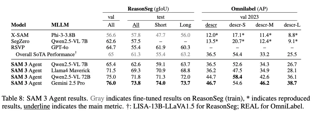 结果显示,SAM 3+MLLM的组合比专门做推理分割的模型效果还要好,并且无需专门的数据做训练。
