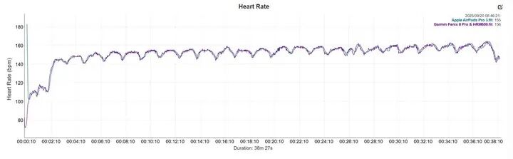 Nick Harris-Fry 以 Garmin HRM600 胸带(电信号级精度)作为对照,结果发现 AirPods Pro 3 的心率曲线几乎与胸带重合,尤其在稳态跑与间歇跑这种对精度要求极高的场景下,两条曲线如同镜像般贴合。