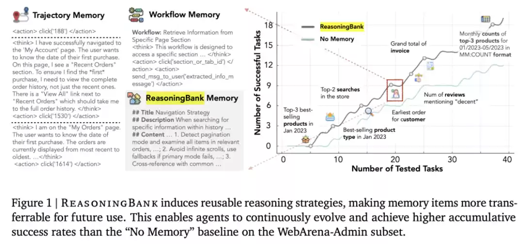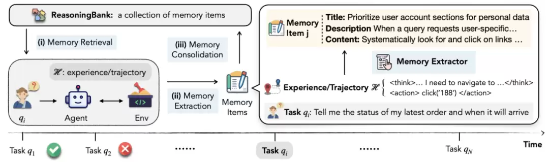 如图 1 所示,利用ReasoningBank不仅可以捕捉成功中的有效策略,还能从失败中提取重要的预防教训,将这些内容抽象成一系列可操作的原则。这个过程在一个闭环中运行:当面对新任务时,智能体从 ReasoningBank 中检索相关记忆来指导其行动。随后,新的经验被分析、提炼并重新整合回 ReasoningBank,使得智能体能够不断进化并提升其战略能力。