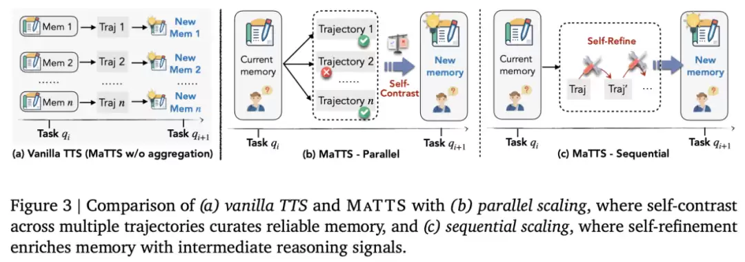 并行扩展。在并行设置中,谷歌在检索到的记忆项的指导下,为同一查询生成多个轨迹。通过对不同轨迹进行比较,智能体可以识别一致的推理模式,同时过滤掉虚假的解决方案。这个过程通过单一查询的多次试验促使多样化的探索,从而实现更可靠的记忆策划。