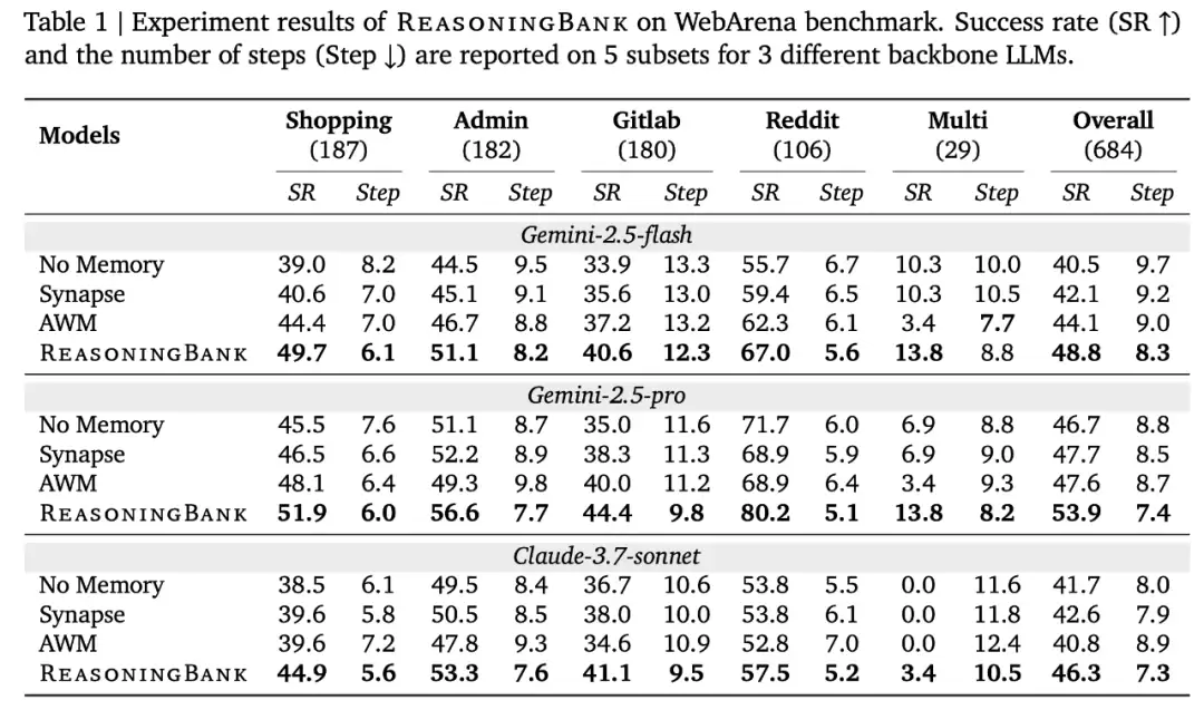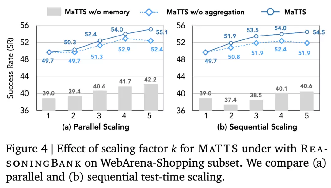 特别地,ReasoningBank 与 MaTTS 的协同效果最好,使其成为基于记忆的经验扩展的关键组成部分。谷歌在 Webarena-Shopping 子集上实验了 MaTTS 与 Gemini-2.5-flash 的结合。默认下,MaTTS 集成了 ReasoningBank,但它也可以使用其他记忆机制。