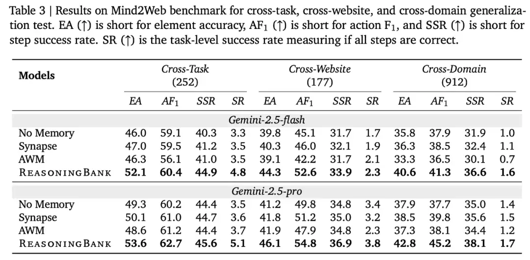 表 1、2、3 分别展示了 ReasoningBank 在 WebArena、Mind2Web 和 SWE-Bench-Verified 上的评估结果,表明了在有效性(相对提高高达 34.2%)和效率(减少 16.0% 的交互步骤)上均优于基准方法。