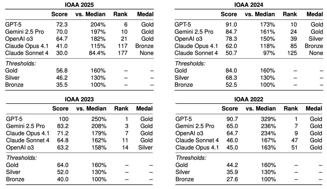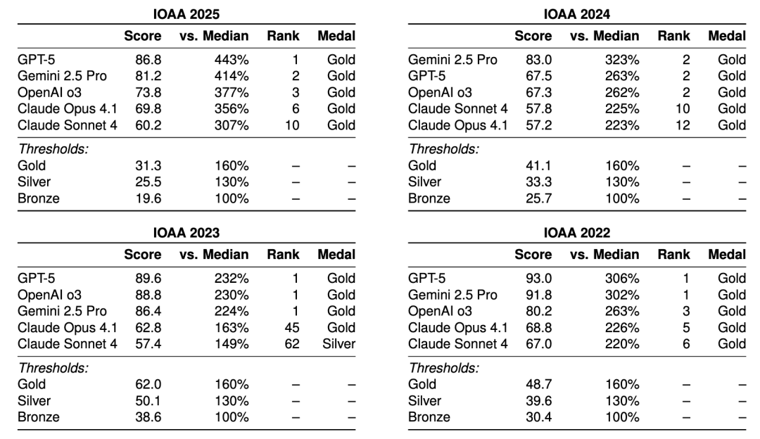 就在最近,一篇全新发布的论文中,将国际天文学和天体物理学奥林匹克竞赛 (IOAA)作为基准测试,证明了 GPT-5 和 Gemini 2.5 Pro 两大模型能够在天文和天体物理学中取得奥赛金牌成绩。