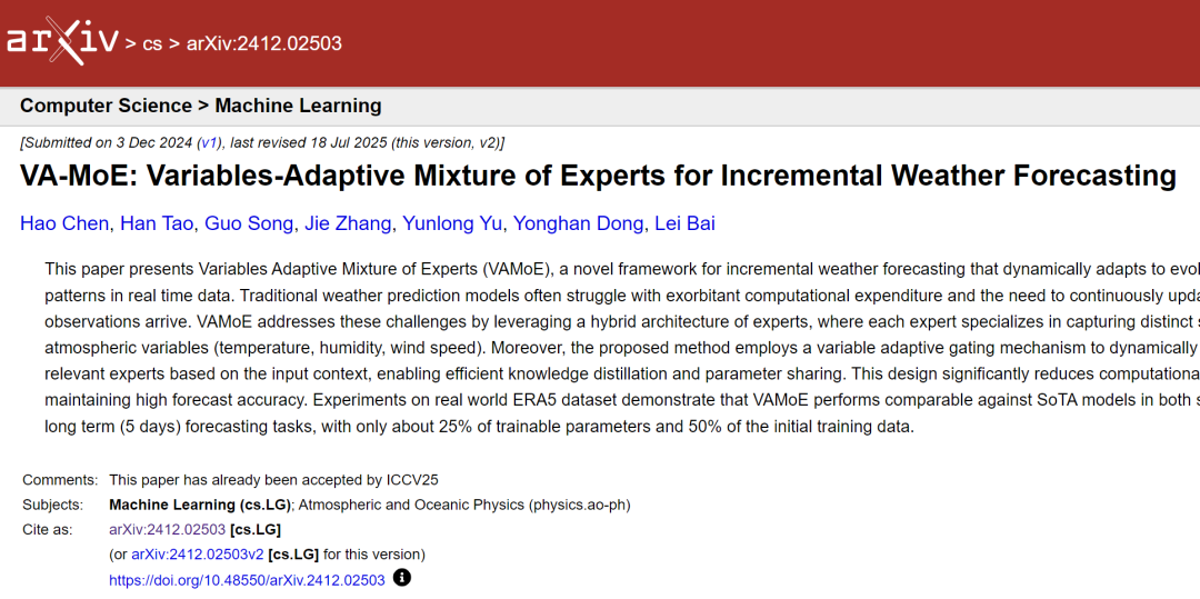 相关研究成果以「VA-MoE: Variables-Adaptive Mixture of Experts for Incremental Weather Forecasting」为题,已被计算机视觉领域国际顶会 ICCV25 接收。