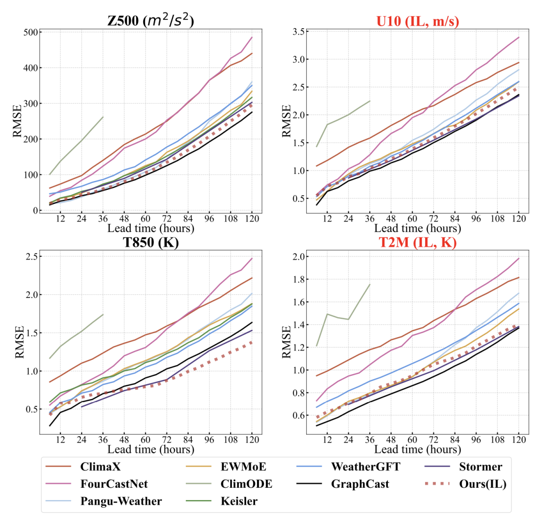 高空变量预测进一步验证了 VA-MoE 的增量优势。研究比较了 3 种训练策略:仅训练高空变量的 VA-MoE、增量加入地面变量的 VA-MoE(IL),以及传统联合训练模型。结果显示,仅训练高空变量的 VA-MoE 精度已与 GraphCast 相当,优于 IFS 与 Pangu-Weather;而增量式 VA-MoE 在引入地面变量后,未出现对高空变量的预测能力退化,且在 500hPa 位势高度(Z500)的长期预报中精度有所提升,验证了其「学新不丢旧」的能力。