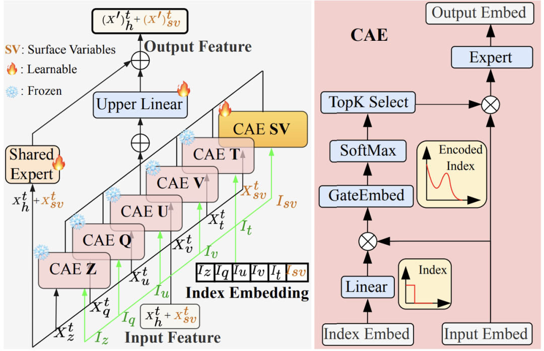 在此基础上,如下图所示,模型构建了「专精+协同」的专家体系。针对训练阶段的 5 类核心变量(如 Z500、温度、风速等),一方面为每类变量配置独立的「通道自适应专家(Channel-Adaptive Experts, CAE)」,例如温度 CAE 仅专注于温度的时空演变规律,结合温度的「身份标签」筛选关键特征(如昼夜温差、锋面过境时的温度骤变),通过专业化建模提升单变量预报精度;另一方面设置「共享专家(Shared Expert)」模块,整合所有 CAE 输出的局部信息,捕捉多变量间的系统级关联(如温度升高→气压降低→风速增强的连锁反应),避免因过度专精导致的「只见树木不见森林」,确保模型能还原大气系统的整体动力学行为。
