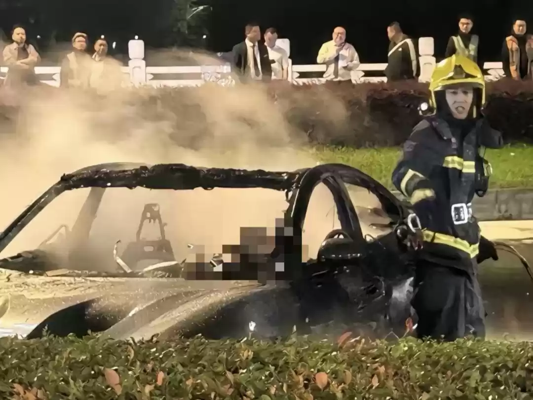 从社交媒体上的视频片段可以看出,有四位途径事故现场的人先后尝试拉门把手打开车门、破窗开门等救援措施,但车窗玻璃没有被破开,车门无法打开。随后,整个车身被火焰吞没,从现场图片看,整辆汽车被烧到只剩下铁架子。
