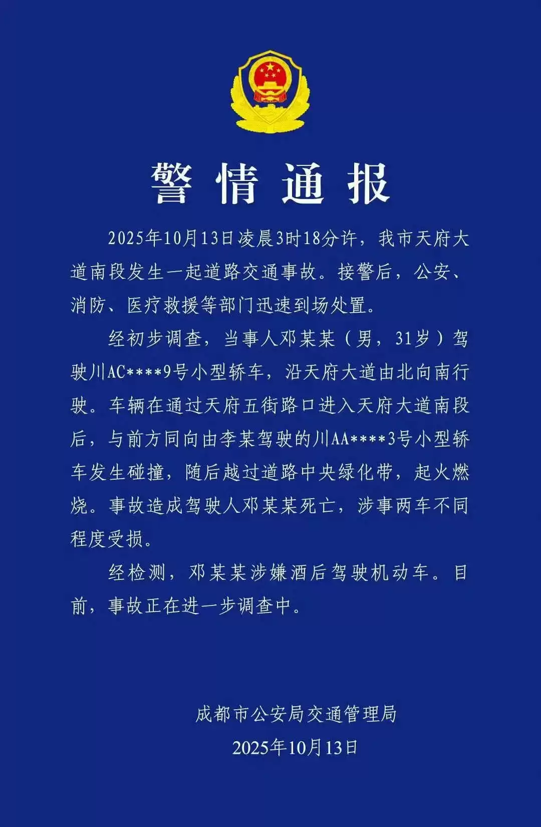 13日下午,成都市公安局交通管理局的一份警情通报显示:2025年10月13日凌晨3时18分许,我市天府大道南段发生一起道路交通事故···经初步调查,当事人邓某某(男,31岁)驾驶川AC****9号小型轿车···与前方同向由李某驾驶的川AA****3号小型轿车发生碰撞,随后越过道路中央绿化带,起火燃烧,事故造成驾驶人邓某某死亡···经检测,邓某某涉嫌酒后驾驶机动车。