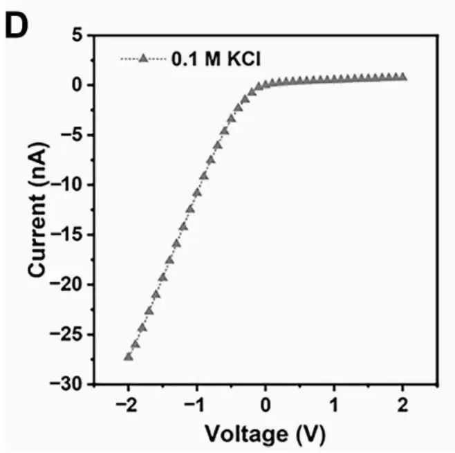 实验结果令人兴奋:当使用盐酸(HCl)溶液时(其中的阳离子主要是质子H⁺),芯片的电流随电压变化呈现出强烈的非线性。