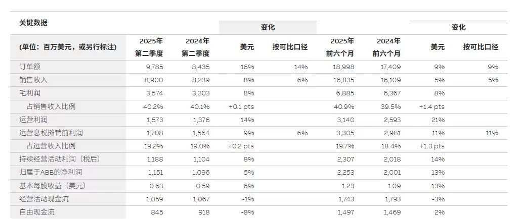 2025年上半年,ABB订单额与销售收入继续同比增长16%和8%,分别达到97.85亿美元和89亿美元。四个事业部中,三个部门贡献增长,唯独机器人与离散自动化事业部因机械自动化业务疲软而持续承压。