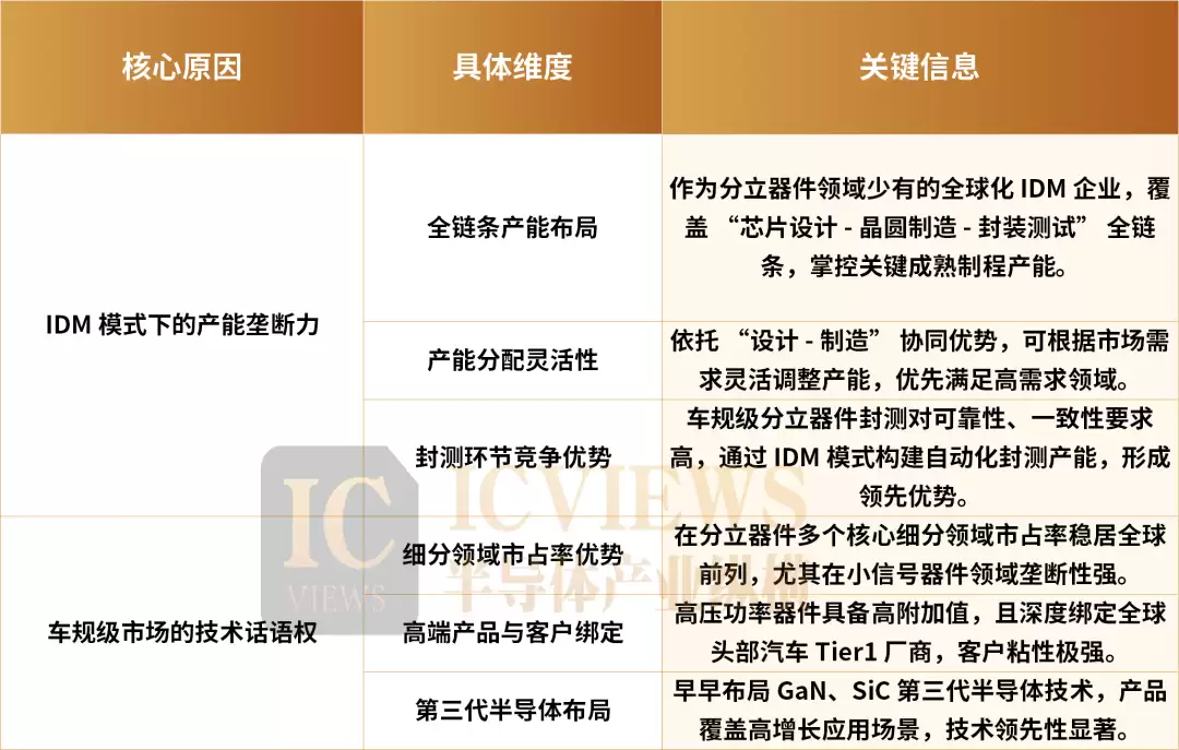 此外,封测作为半导体制造的后道环节,看似门槛较低,但车规级分立器件的封测对可靠性、一致性要求极高,安世半导体通过IDM模式构建的自动化封测产能,同样形成了明显领先优势。
