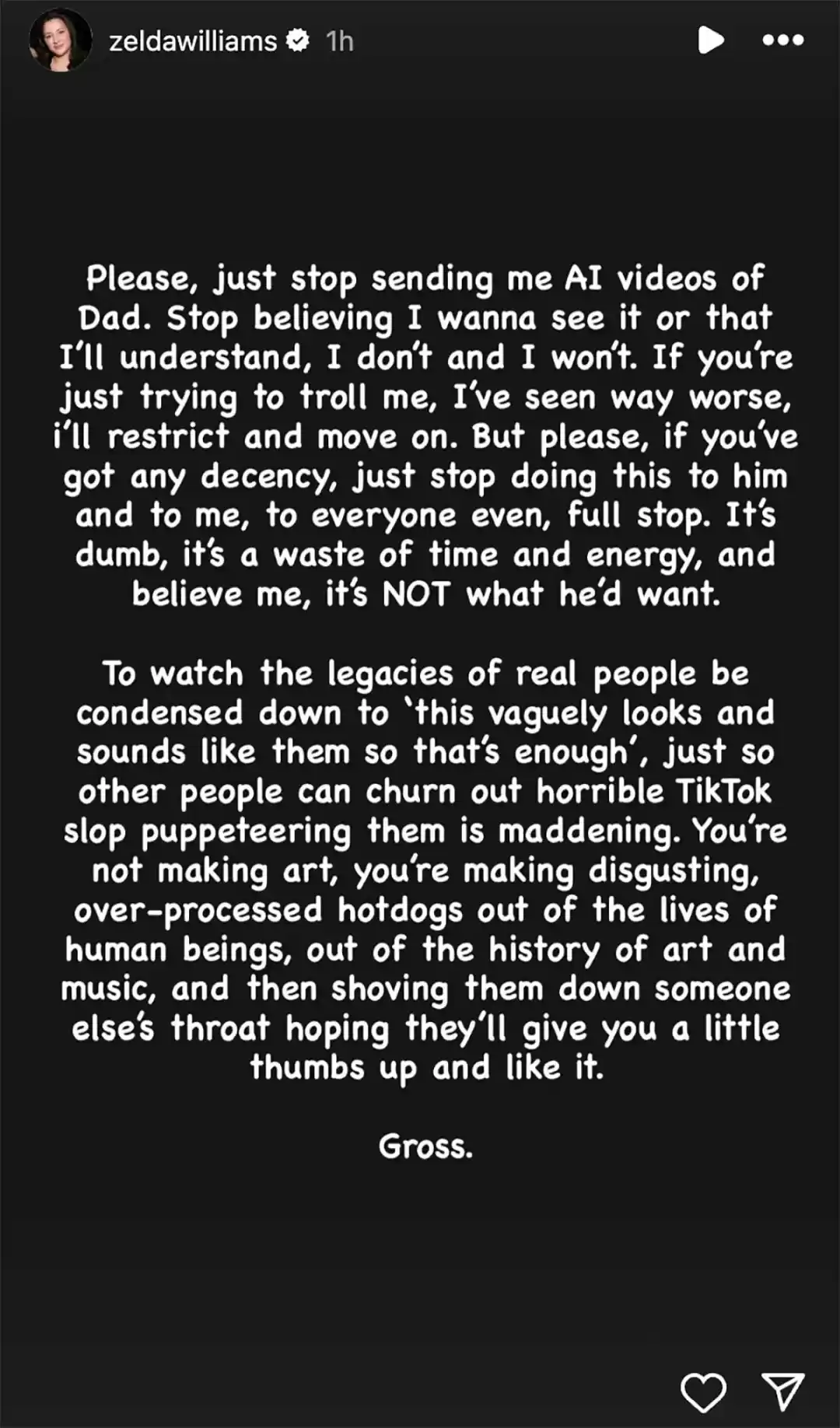 [3]https://www.theguardian.com/film/2025/oct/07/robin-williams-daughter-zelda-hits-out-at-ai-generated-videos-of-her-dead-father