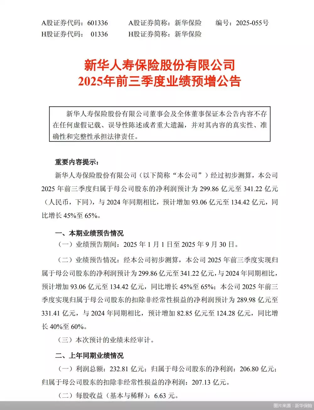 2025年10月13日,新华人寿保险股份有限公司披露前三季度业绩预增公告。根据初步测算,公司预计2025年1-9月实现归属于母公司股东的净利润299.86亿元至341.22亿元,较2024年同期增加93.06亿元至134.42亿元,同比增长45%至65%;扣除非经常性损益后的净利润预计为289.98亿元至331.41亿元,同比增幅达40%至60%。
