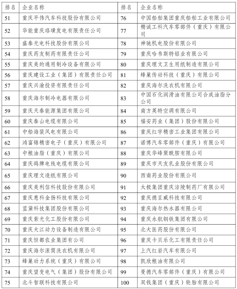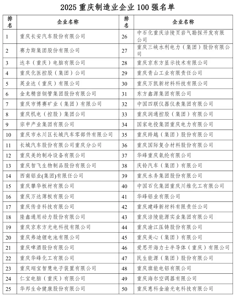2025重庆制造业百强企业揭晓