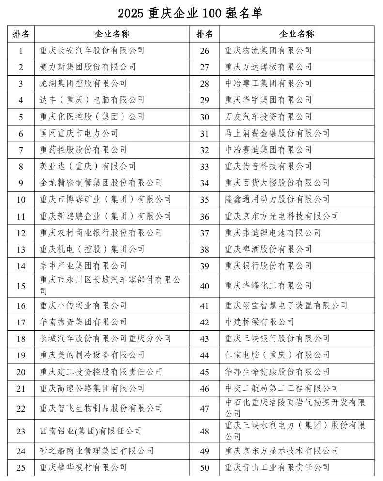 2025重庆企业百强榜公布:赛力斯跃居第二
