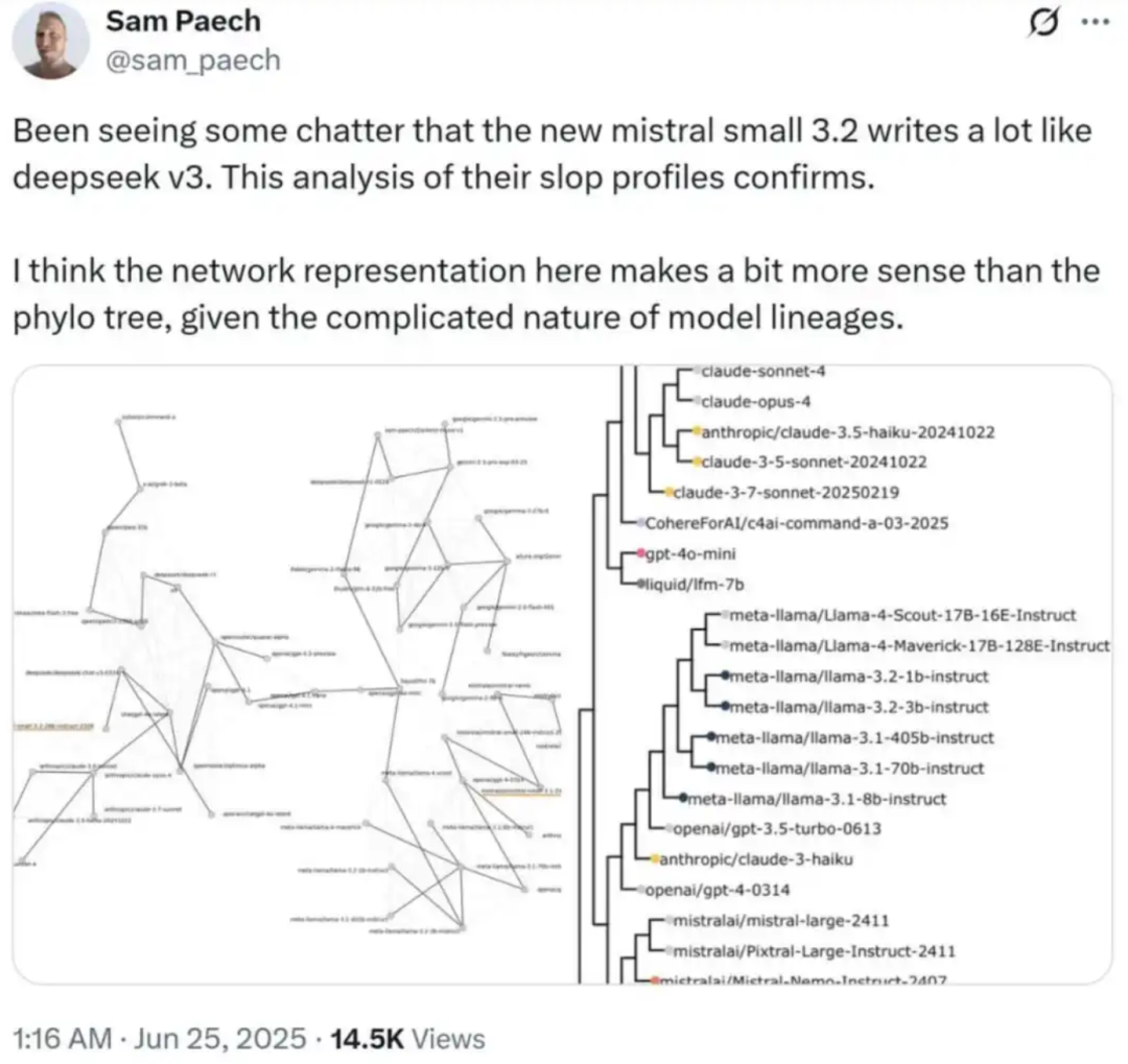 而早在今年6月,就有博主通过“语言指纹”分析发现,Mistral-small-3.2与DeepSeek-v3极为相似。更讽刺的是,年初还有网友调侃DeepSeek是“中国的Mistral”,半年后剧情反转——欧洲的Mistral反被质疑“借”了中国的成果。