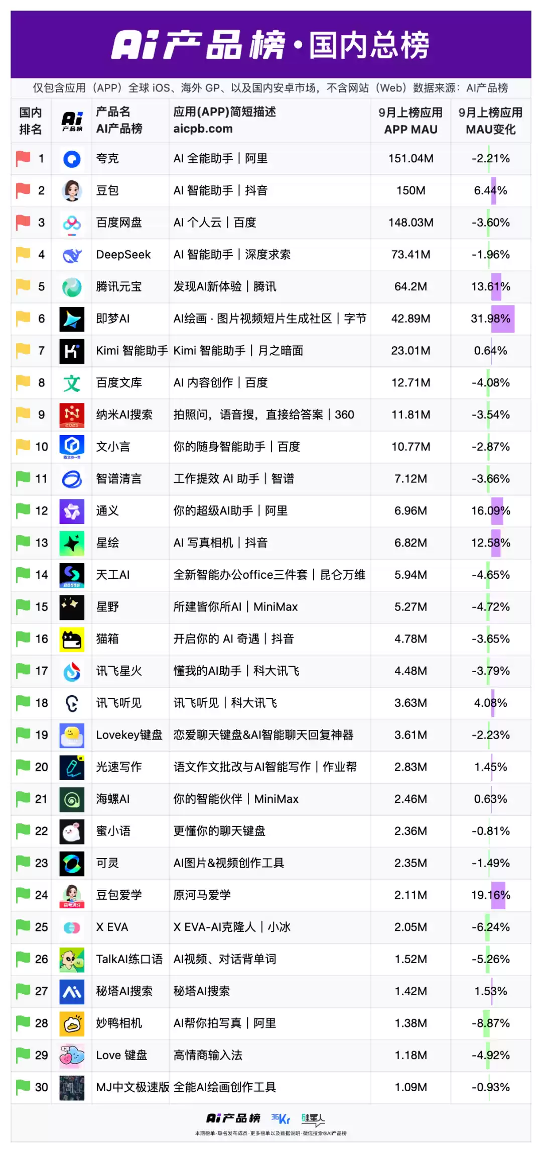 前三名毫无悬念:夸克、豆包、百度网盘。唯一闯进前十的创业公司,只有DeepSeek和Kimi。