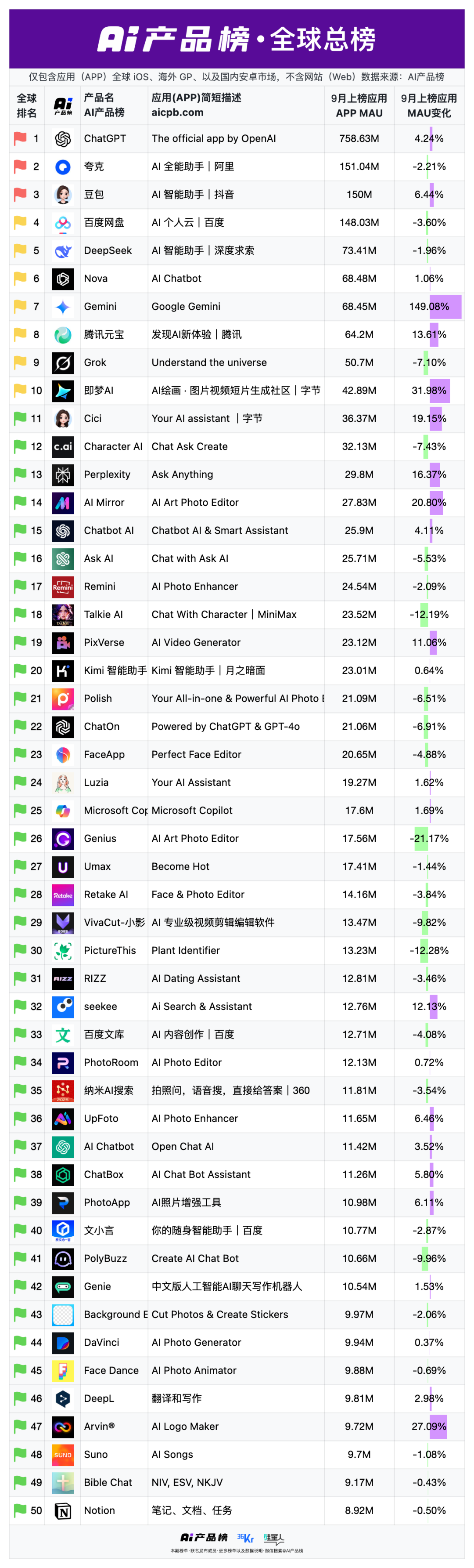 一个数据印证了这一趋势:在AI产品榜全球Top50中,34个国外应用里仅有5个出自“大厂”。