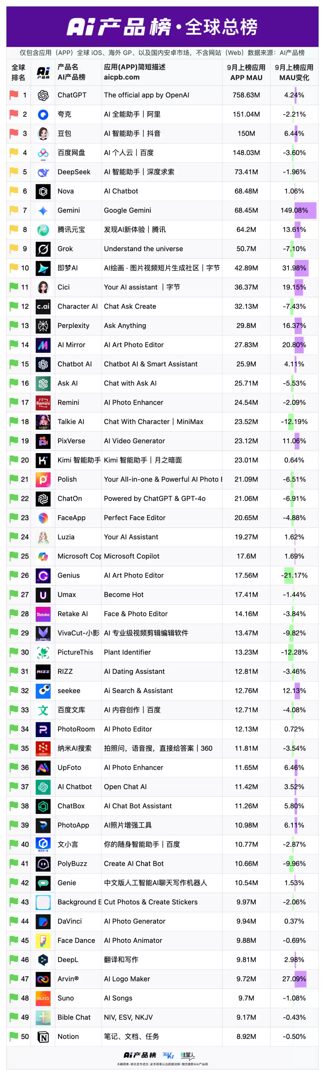 全球榜单上共有34个非中国产品,但只有5个属于“大厂”,占比只有15%,比如ChatGPT(OpenAI)、Gemini(Google)、Grok(X)、Character.AI(Google)和Microsoft Copilot。其他几乎全是Perplexity、PhotoRoom这样的小团队或创业公司。