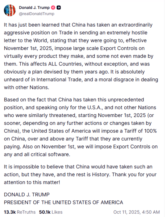 但特朗普却对此事产生了强烈抵触。时间来到10月11日凌晨4点50,特朗普在社媒上突然发文,表示对中国政策强烈不满,并报复性强调将自11月1日起对中国征收100%的关税。一夜之间,全球金融市场大变天,三美国大股指全线重挫,道琼斯工业平均指数大跌 1.9%,标普 500 指数暴跌 2.71%,而纳斯达克综合指数更是重挫 3.56%,创下自 4 月以来的最大单日跌幅,欧洲股市、原油市场都受到强烈冲击。