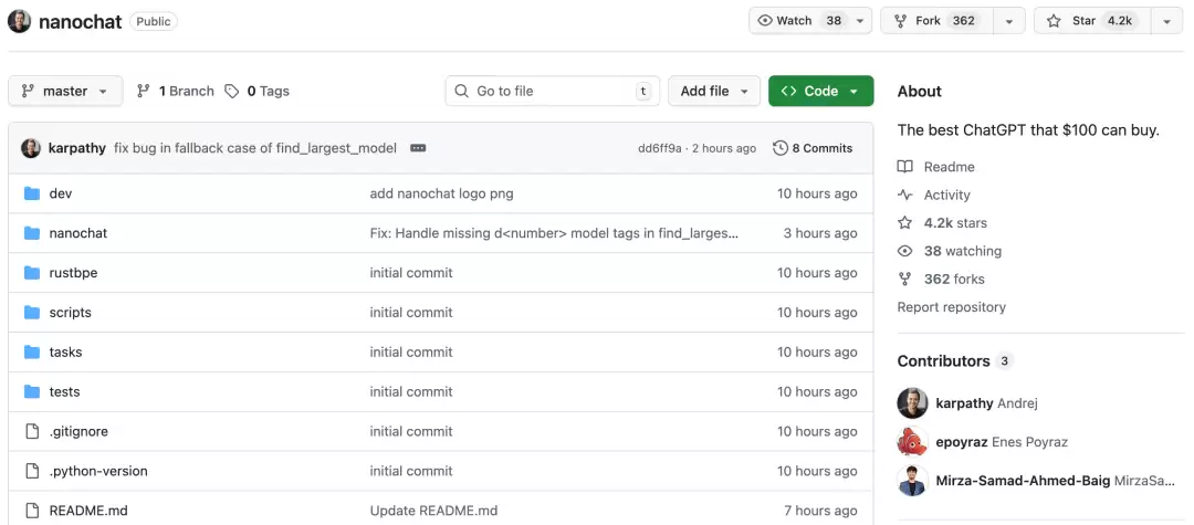AI传奇人物、前特斯拉AI总监Karpathy重磅推出全新开源项目「nanoc h a t」,以不到8000行代码复现ChatGPT全流程,只需一台GPU、约4小时、成本仅百美元。该项目在GitHub上线不到12小时即获4.2k星标!