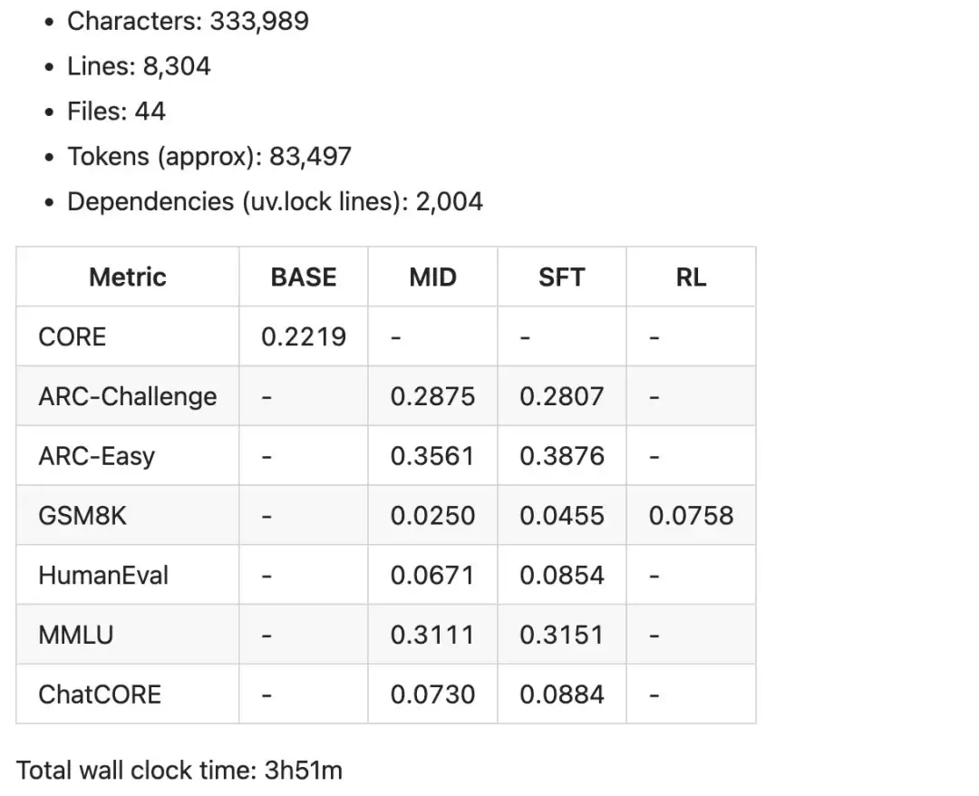 下面这张图展示的是Karpathy在nanoc h a t「$100速度跑」实验(即只用一台GPU、约4小时训练出的ChatGPT 小模型)中生成的「成绩单」部分内容,说明模型规模、训练耗时、以及在各类标准评测上的性能。