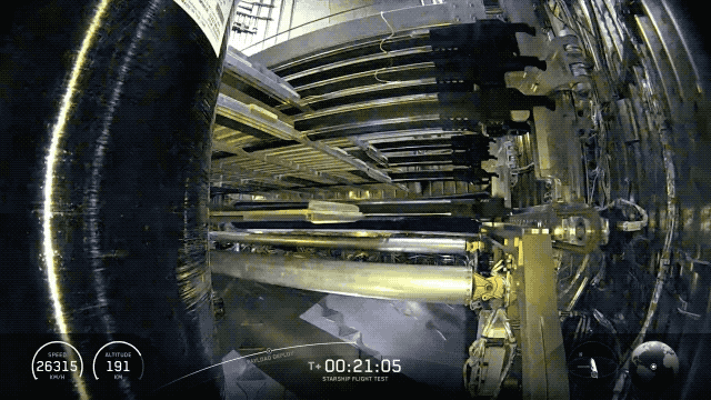 飞船侧面的大型舱板——被称为「有效载荷门」的舱口打开后,开始释放模拟卫星。与其他火箭通常通过鼻锥释放卫星不同,星舰采用侧边舱门设计,必须打开这道侧门才能将卫星释放到太空。