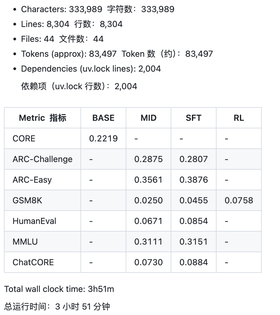 下图是 Karpathy 这次 100 美元快速训练(speedrun)示例在报告中产出的一些指标摘要。