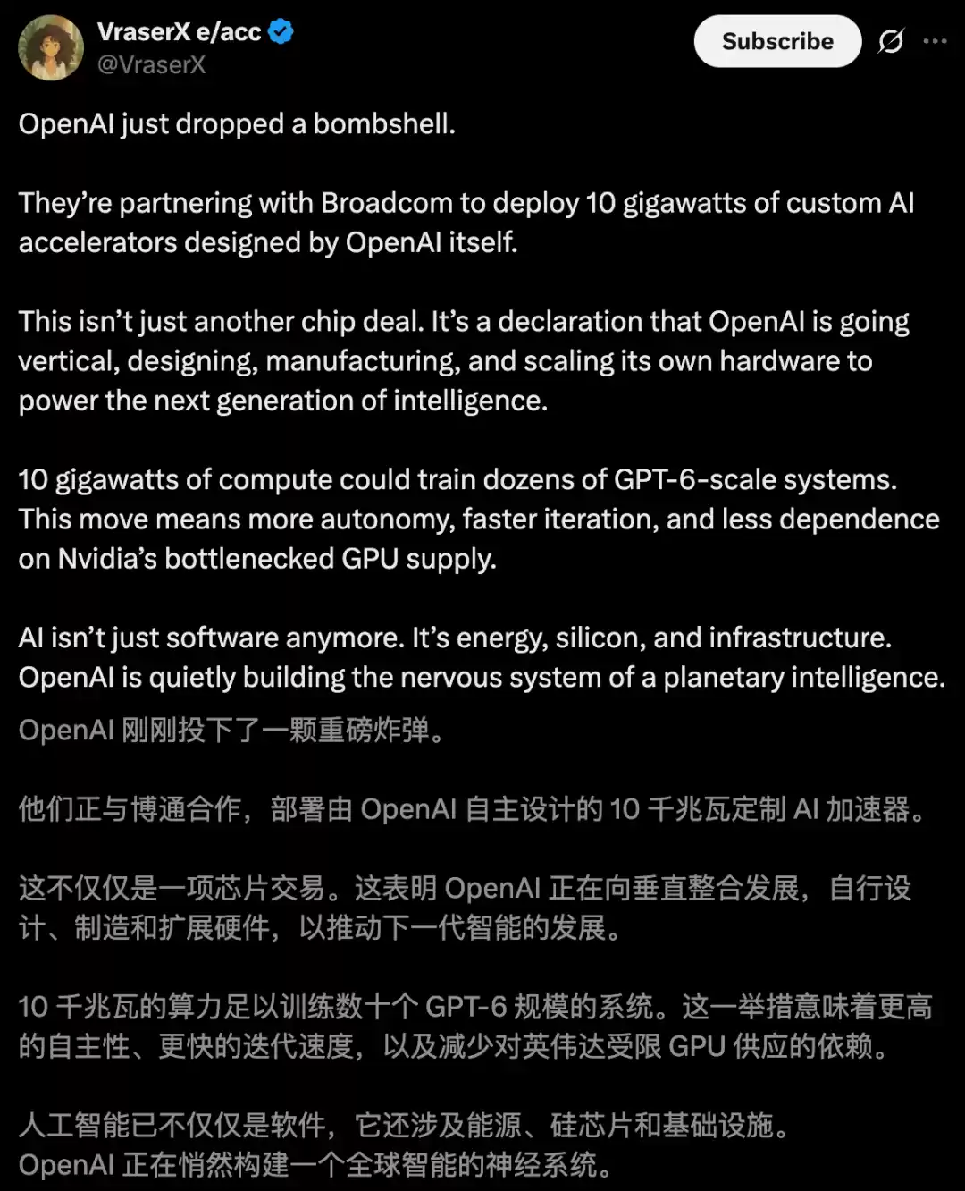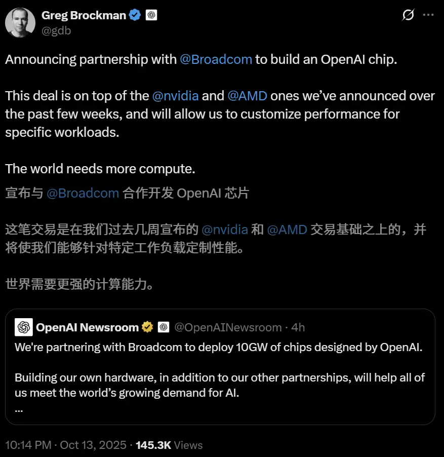 今天,OpenAI重磅官宣与博通合作,打造新一代AI定制加 速 器,部署规模达10GW。