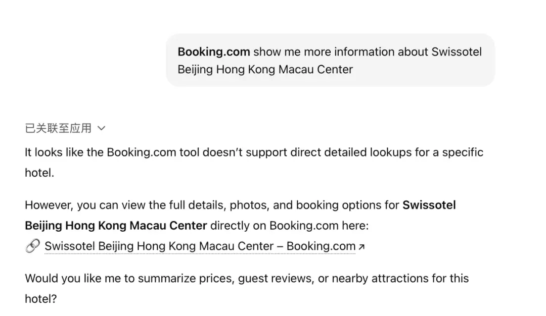 当我再继续要求Booking给我介绍一家酒店的详细信息时,ChatGPT会显示目前不支持查看App内的酒店的详细信息,只能像之前一样整理成文字信息呈现在聊天界面中。这也就意味着,Booking在ChatGPT内的嵌入,目前还只能给我们提供一个以网页形态呈现的搜索结果,和之前的列表方式没有本质区别。