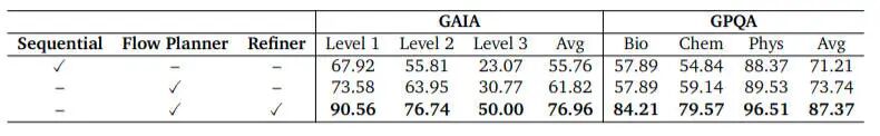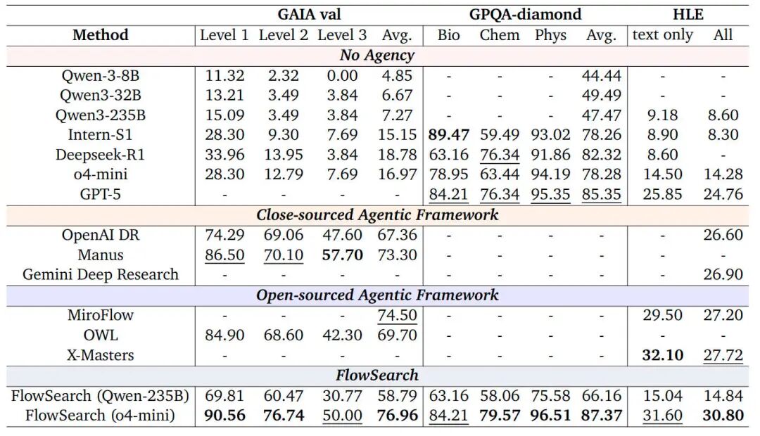 FlowSearch在三大权威基准GAIA、GPQA-diamond、HLE上,全面超越现有方法。