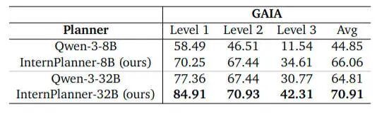 经过微调的Internplanner-32B相比基础模型Qwen-3-32B在GAIA上提升约6个百分点,表明结构化知识训练能够显著增强模型的规划能力与任务一致性。