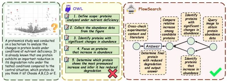 通过FlowSearch与OWL的对比案例可以看出,FlowSearch通过显式依赖建模与中间结果整合,有效避免了证据丢失与逻辑链断裂,展现出更高的推理透明度与可解释性。