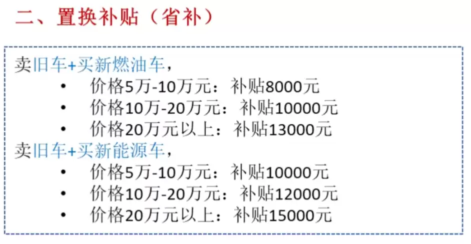 再就是加了置换补贴。就是说你手里旧车不一定非得拿去报废,你只要转让出去,不管是卖给别人还是咋的,也能拿补贴。